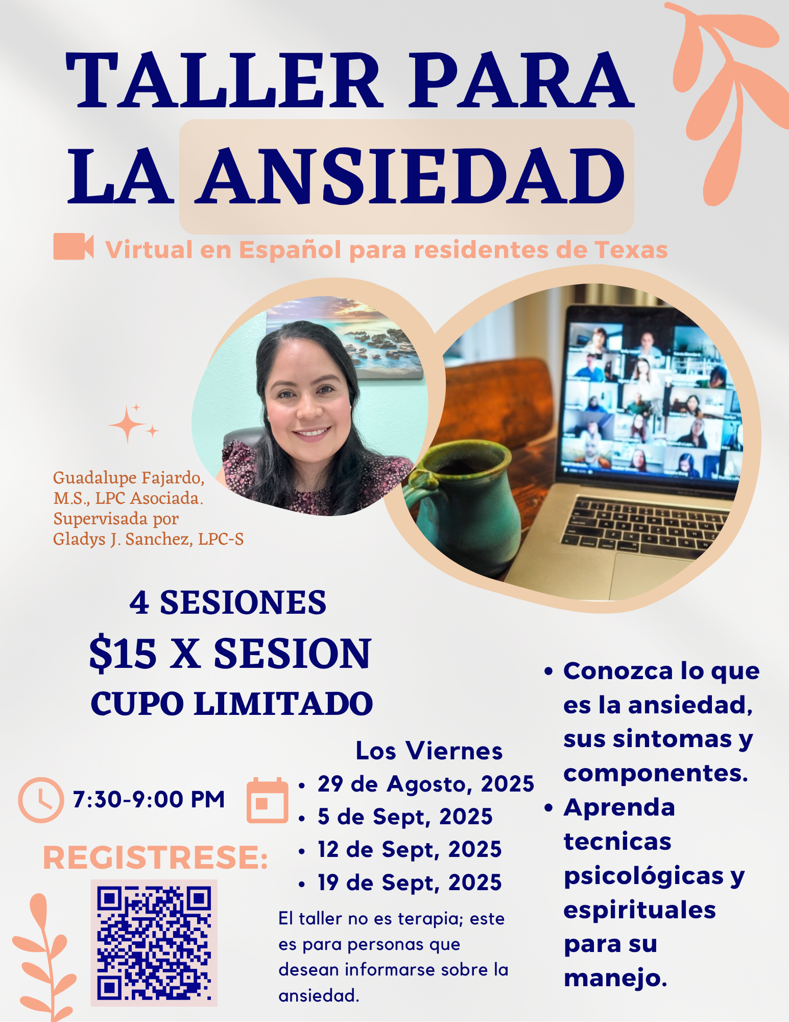 Flyer for an online workshop in Spanish about anxiety, led by Guadalupe Fajardo, scheduled for Fridays in August and September 2025, with a photo of the facilitator and a laptop showing a virtual meeting.